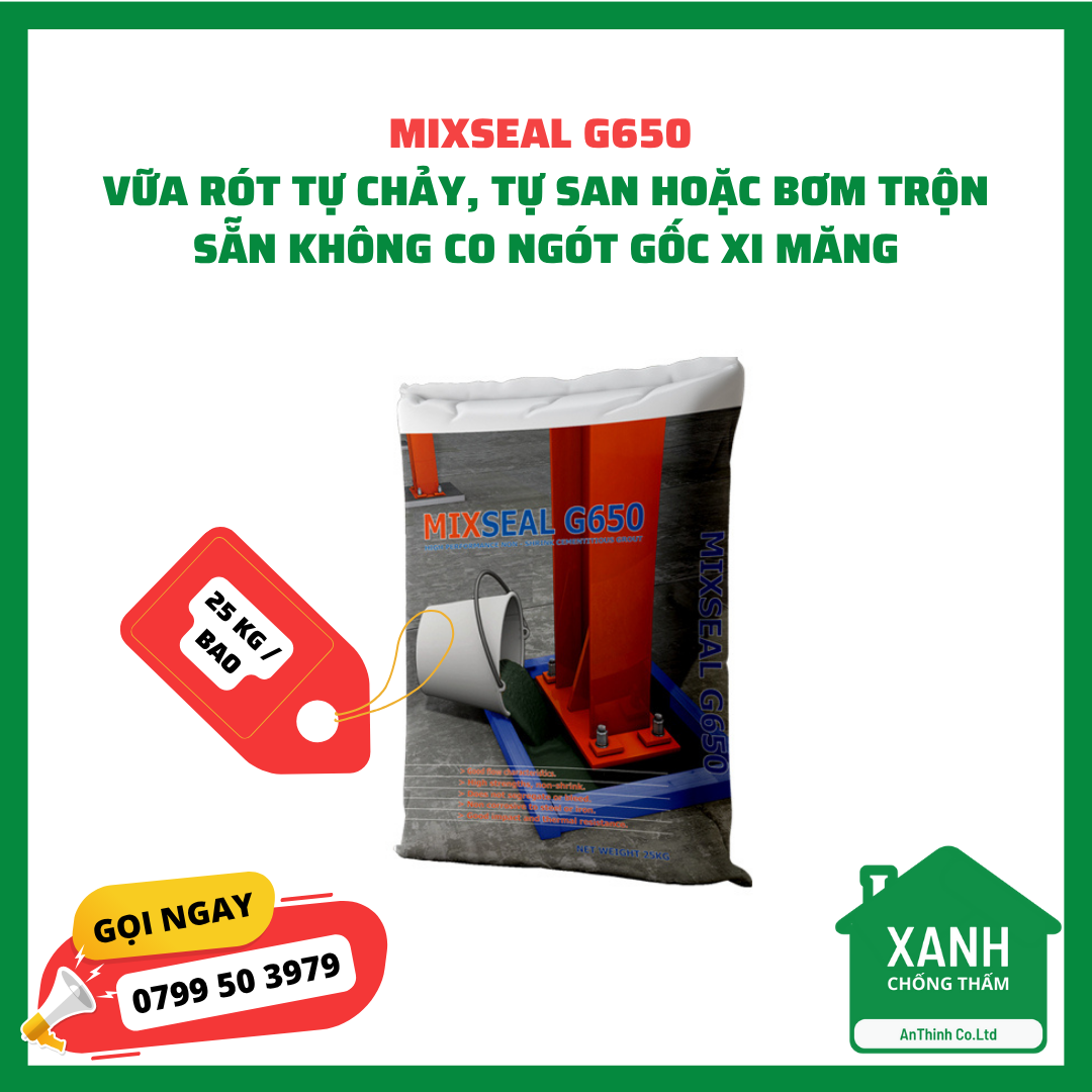 Mixseal G650 là vữa rót tự chảy, tự san hoặc bơm trộn sẵn không co ngót gốc xi măng. Thành phần chính là xi măng Portland cùng với cốt liệu tự nhiên có chọn lọc và các loại phụ gia bù co ngót. Vữa có khả năng tăng nhanh cường độ, kiểm soát được sự giãn nở, không độc hại, thân thiện với môi trường và có hiệu quả kinh tế cao